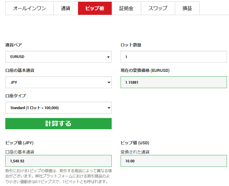計算ツールによるとユーロドルを1ロット取引して10pips動くと1540.92円の損益が発生することが分かりました。