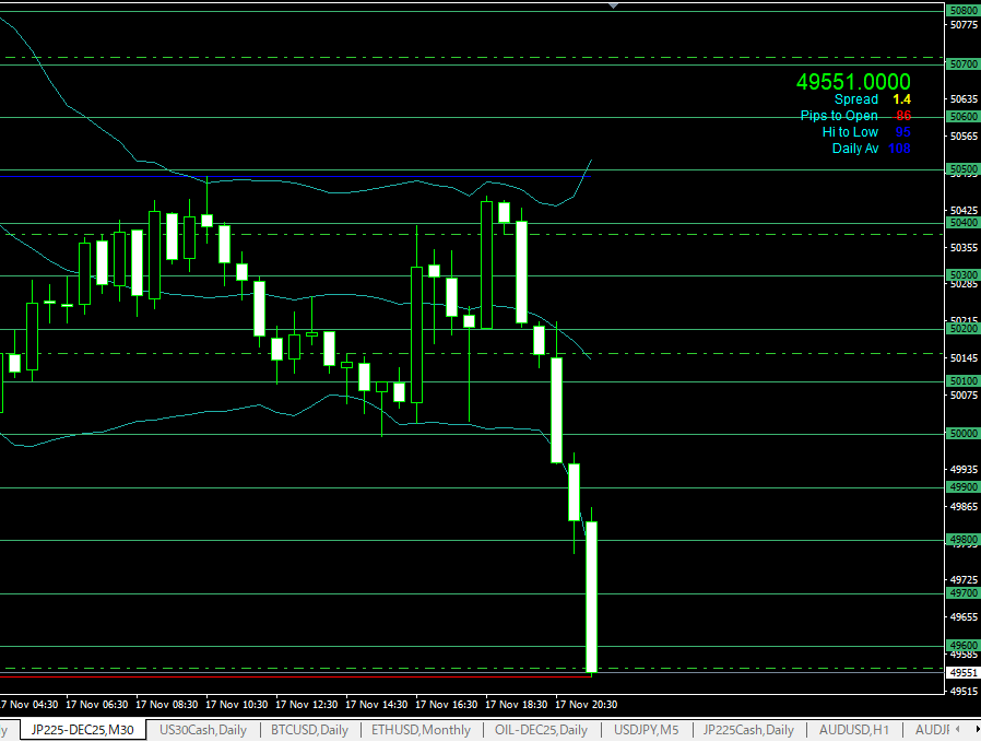 ドル円は円安堅持、NYダウは下落、とくれば日経平均株価はほどよく下落する。