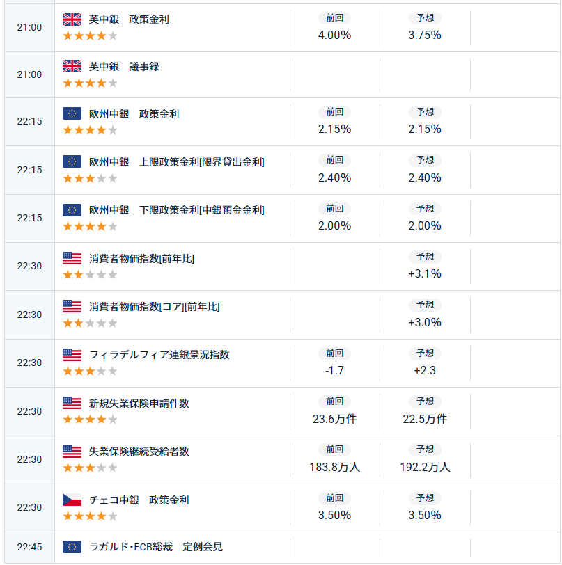 欧州時間以降の経済指標発表予定表